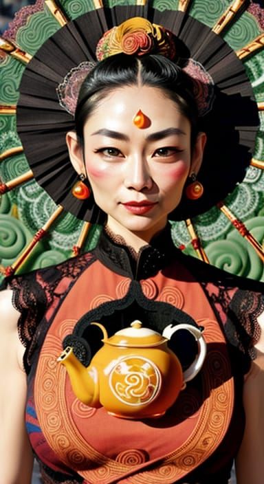 A centered portrait of a woman amidst a ticker tape parade. This image displays elements of both surrealist and collage art styles with detailed anatomy and symmetrical features.