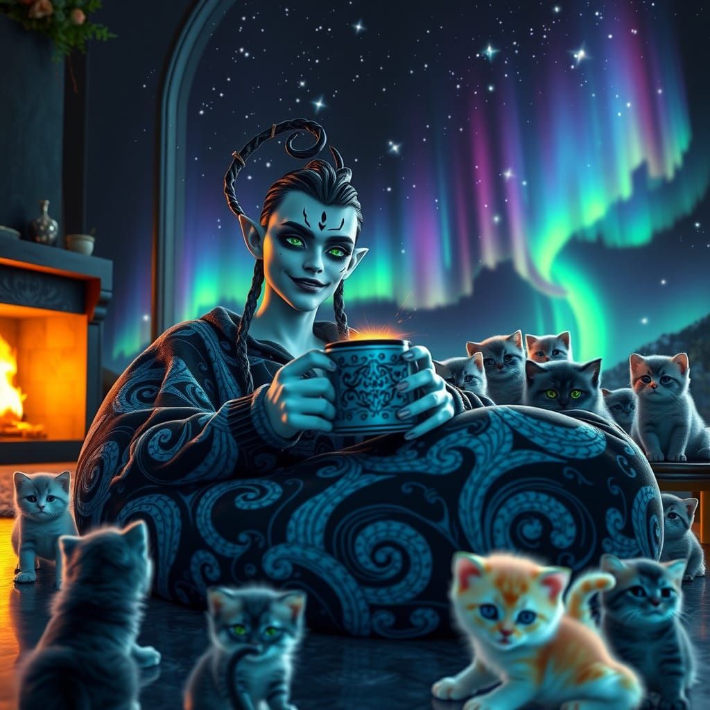 This image shows a young cyberpunk character lounging in a fantasy room, surrounded by crystal and silver filigree walls and a polished black opal floor. He wears comfortable fleece lounge-wear and has velvety black tendrils for hair, with intricate facepaint and black makeup. He holds a warm mug of hot ...