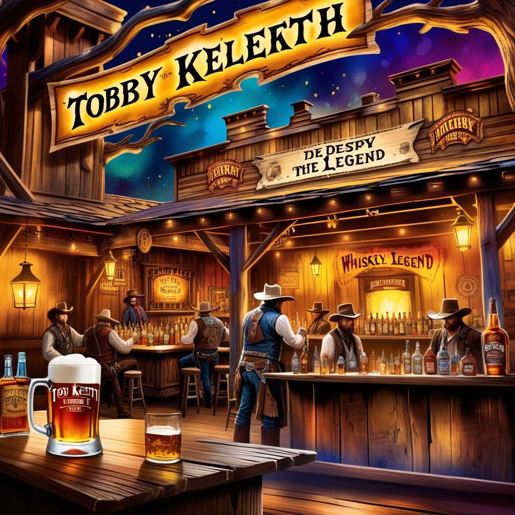 This image shows a busy old west town scene with whiskey and beer being served. It features a vibrant alcohol ink style, deeply saturated colors, intricate textures, and golden, warm lighting.