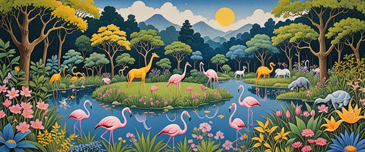 A vibrant image of a mystical forest glade at sunrise, featuring prehistoric plants and animals. The scene is rendered with dreamy colors in a folk art style.