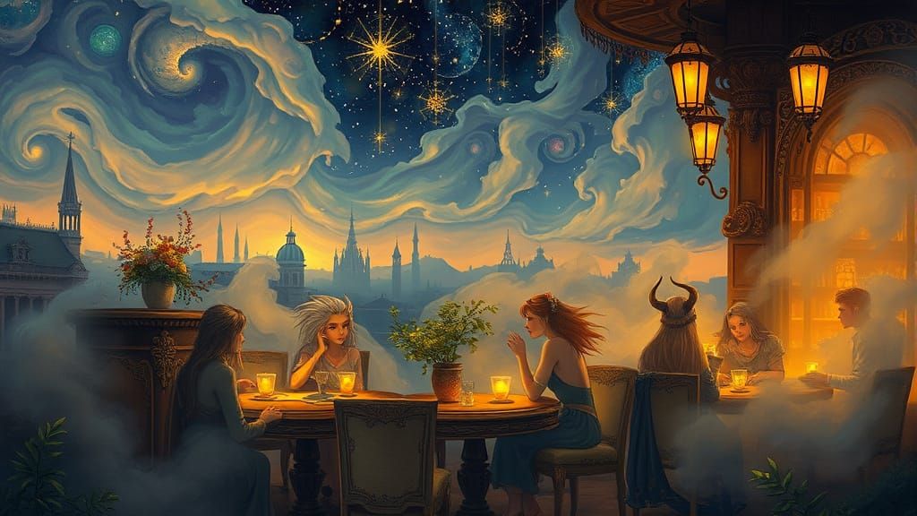 This image depicts a magical cafe at twilight, with swirling mists and surreal starry skies. Mythical beings gather for drinks and stories, bathed in warm golden light. Rendered in a detailed, illustrative style.