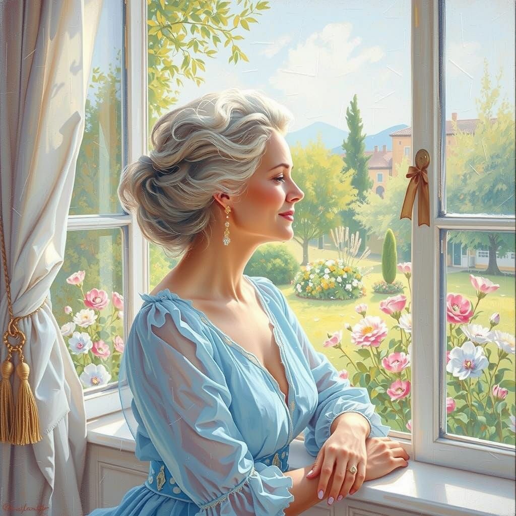 This image shows a serene, 60-year-old Italian woman in a stunning garden setting, surrounded by lush flowers and greenery. She's dressed in a elegant gown, captured in a hyper-realistic oil painting style with thick brushstrokes and textured paint.