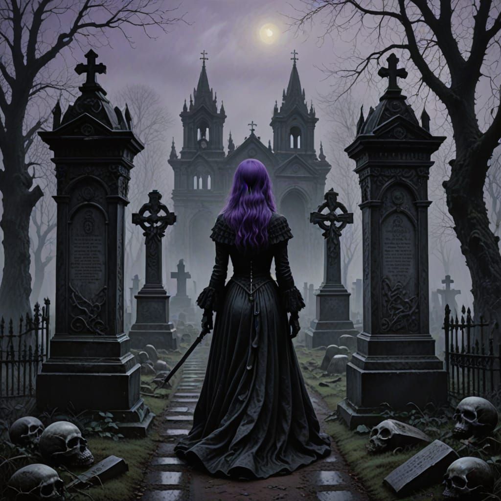 A close-up portrait of a mysterious woman in gothic attire, set amidst a misty cemetery with intricate skull patterns and dramatic shading, evoking a sense of dark fantasy and gothic romance.