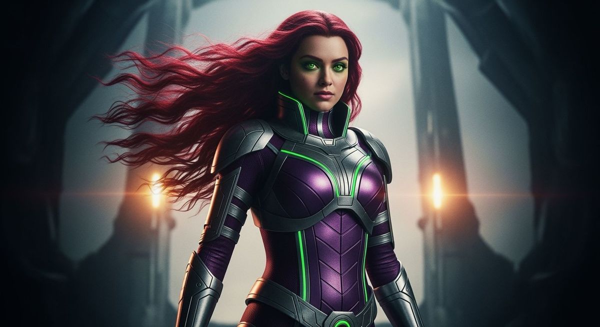 This image features Koriand'r in sleek combat gear, striking a heroic pose with a determined expression. Cinematic lighting and film grain enhance the dramatic, epic mood.