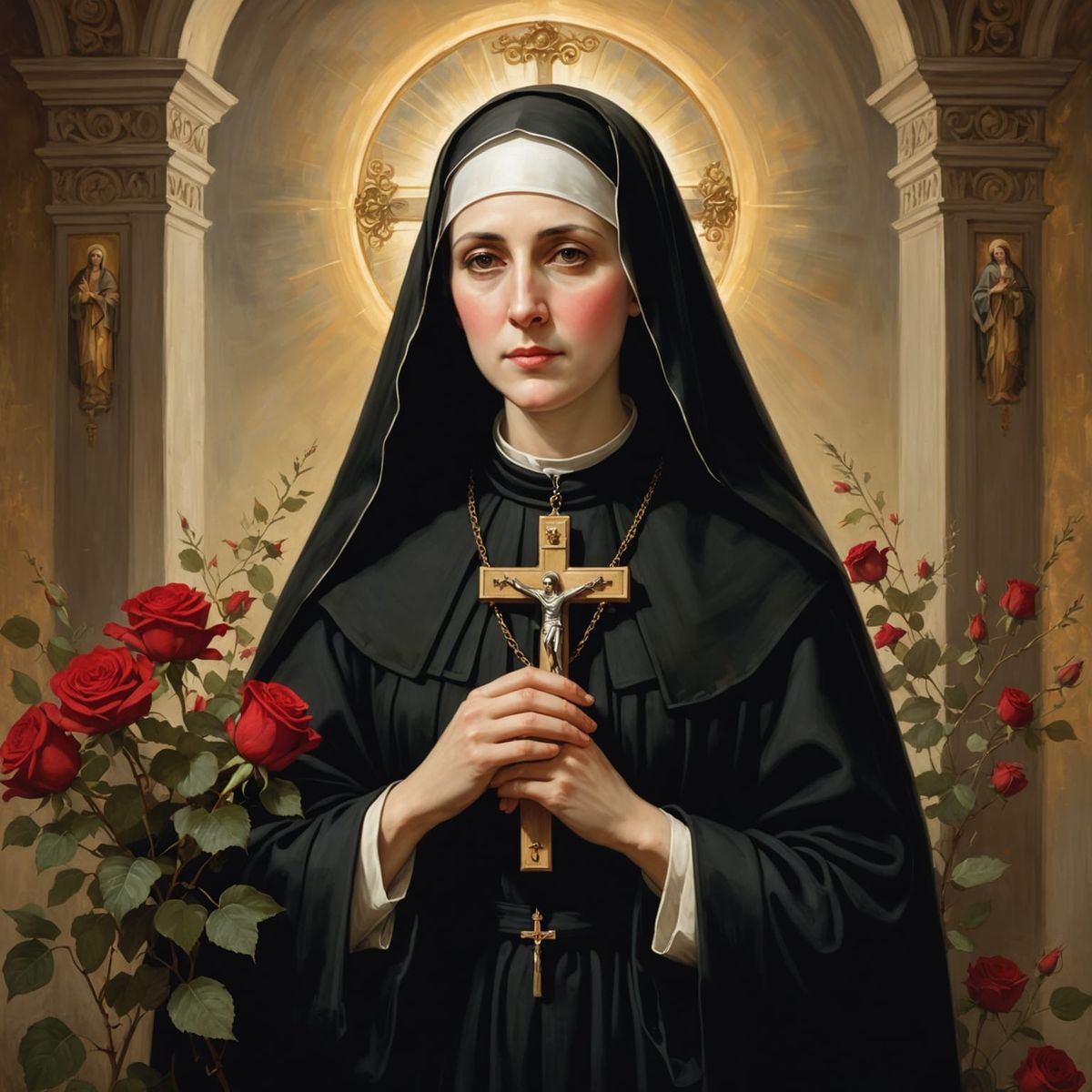 This image portrays Saint Rita of Cascia in a black habit, holding roses and a crucifix. The digital painting, in a classical religious style, features warm tones and soft, glowing light in a sacred convent setting.