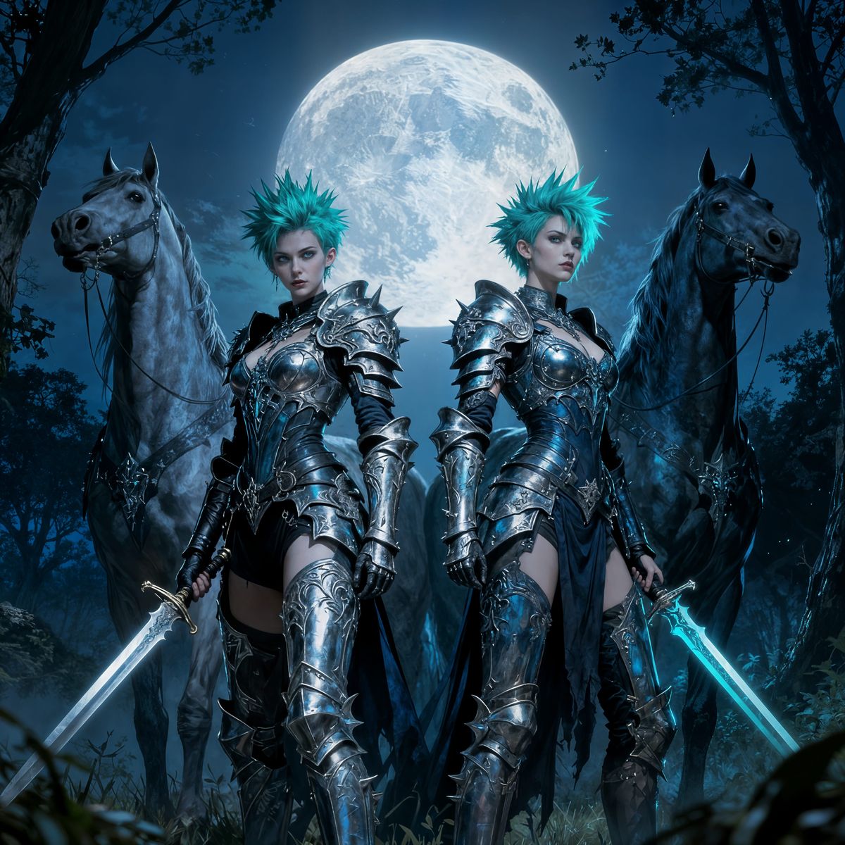 This image features two full-bodied female gothic warriors with turquoise hair and intricate armor, swords drawn. They stand in a moonlit clearing with powerful stallions beside them.