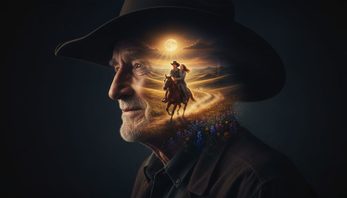 This image features a cowboy's silhouette framing a vivid memory of a young couple riding horses under the moon. A nostalgic, magical scene with dramatic lighting and rich textures.
