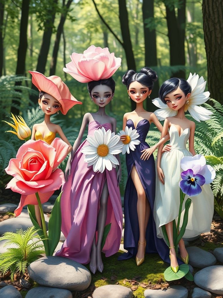 A captivating image of anthropomorphic flowers striking model poses. The flora retains realistic botanical details, crafted into couture gowns in a sunlit forest. The artwork is reminiscent of botanical art using watercolor and gouache.