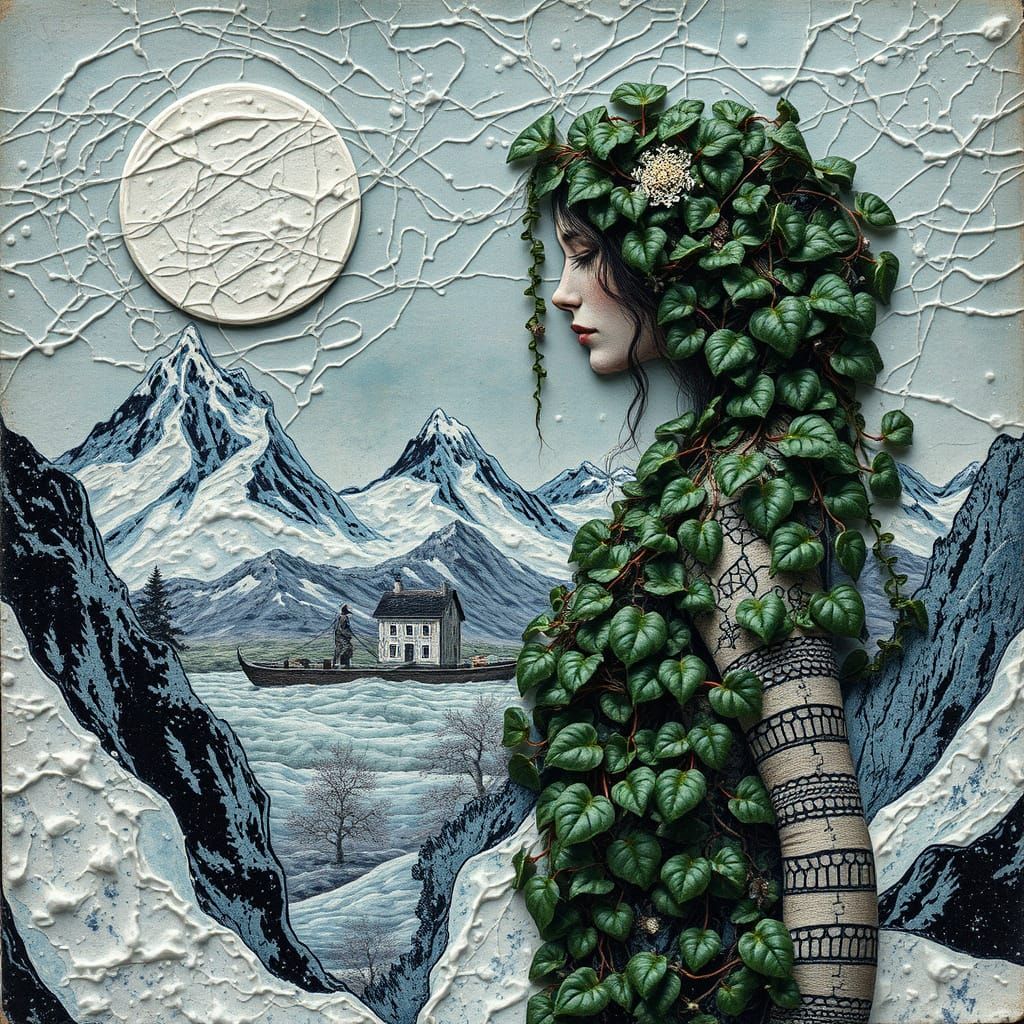 A surreal image of an arctic landscape blended with abstract patterns and textures. The artwork features a vibrant color palette and intricate details, creating a dreamlike and allegorical scene.
