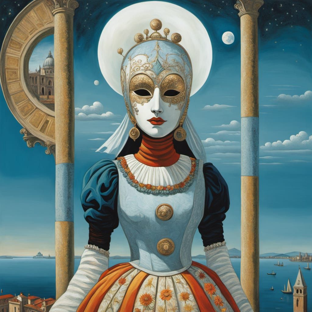 A surreal portrait of a woman in a Venetian mask and dress, with Venice reflected in the skirt. The digital painting features dreamlike elements, vibrant colors, and intricate details in a mystical style.