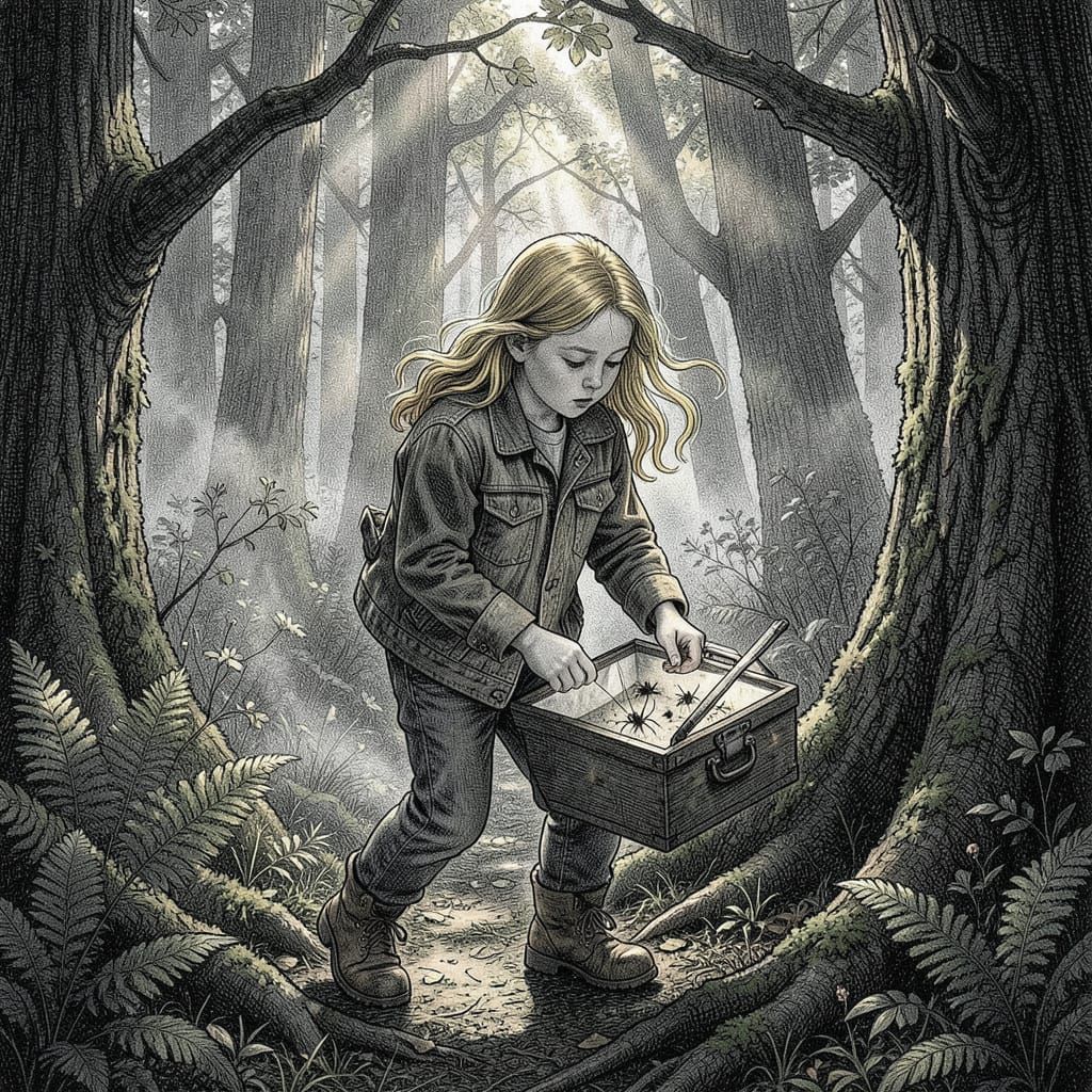 This image shows a determined young girl exploring a sun-dappled Maine forest, seeking orb weaver spiders. Rendered in a highly detailed, dramatic style with chiaroscuro lighting, evoking classic etchings.