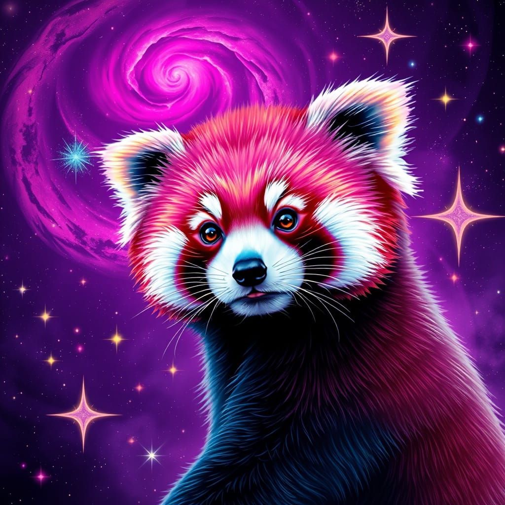 A vibrant Red Panda with iridescent fur gazes from a dazzling purple galaxy. Features bright accents and cosmic nebulae, rendered with hyper-realistic detail and high-key lighting for an otherworldly effect.