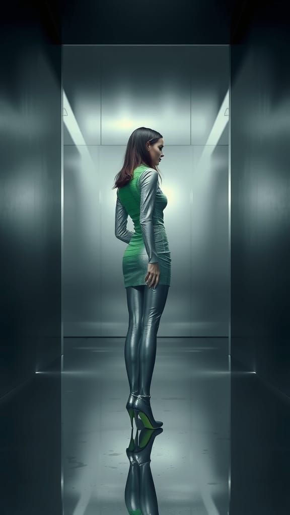 This image shows a surreal, bichromatic portrait of a woman in a silver room. The photorealistic image uses negative space to create an atmospheric and unbalanced scene with dreamlike qualities.