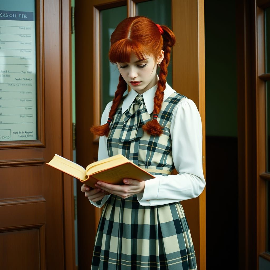 This image captures a red-haired schoolgirl lost in the pages of a novel, dressed in a Victorian-era school uniform, amidst a cinematic atmosphere reminiscent of film noir, with dramatic lighting and a rich color palette.
