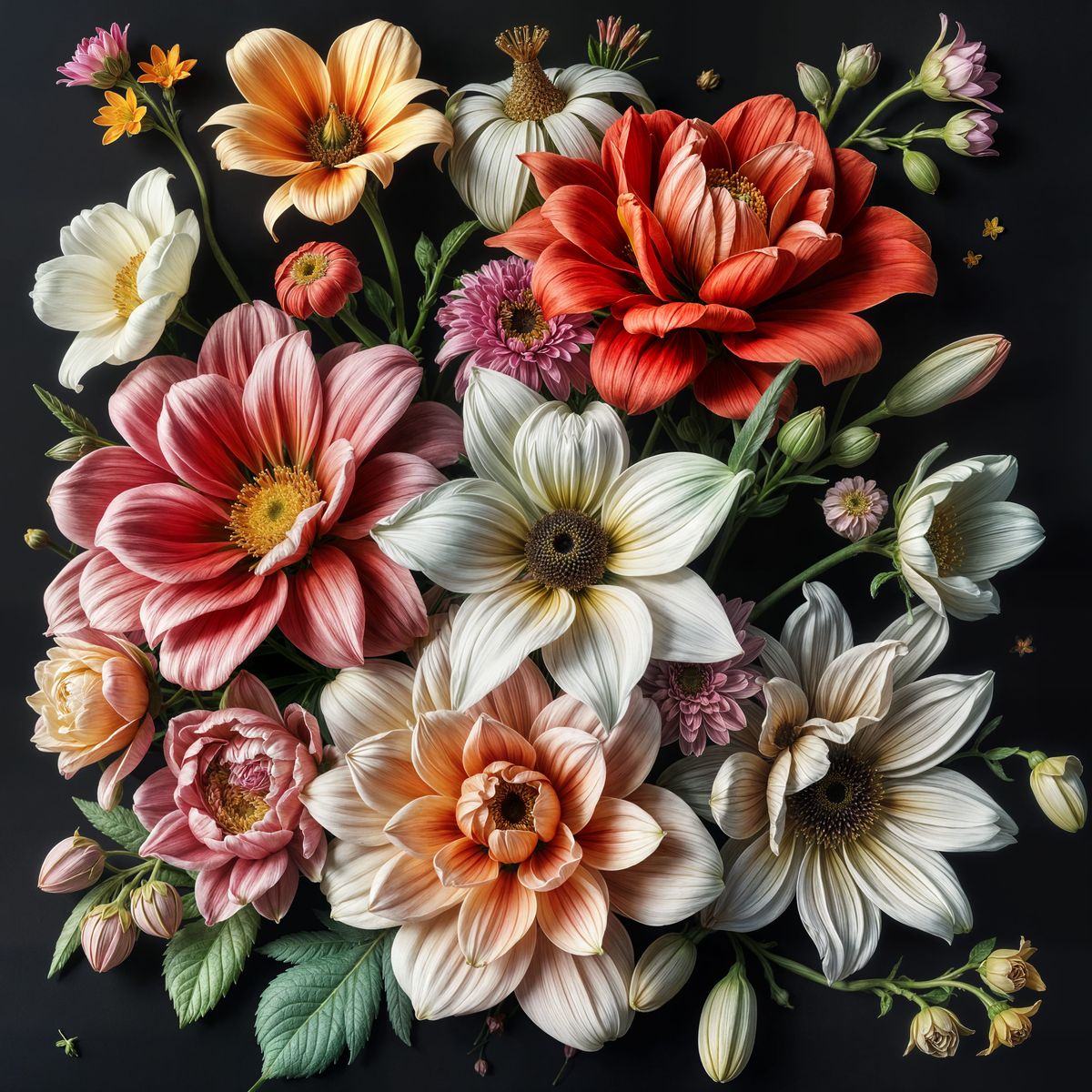 A detailed image showcasing a vibrant array of flowers. The artwork emphasizes intricate details and a rich color palette, creating a visually stunning floral arrangement.