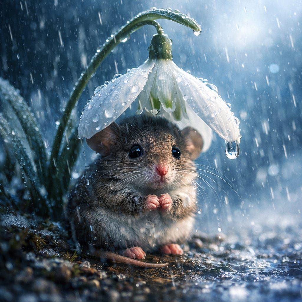 A hyperdetailed digital illustration of a cute mouse sheltering under a snowdrop during a moody, rainy scene. This fine art piece features sharp focus and maximalist detail.
