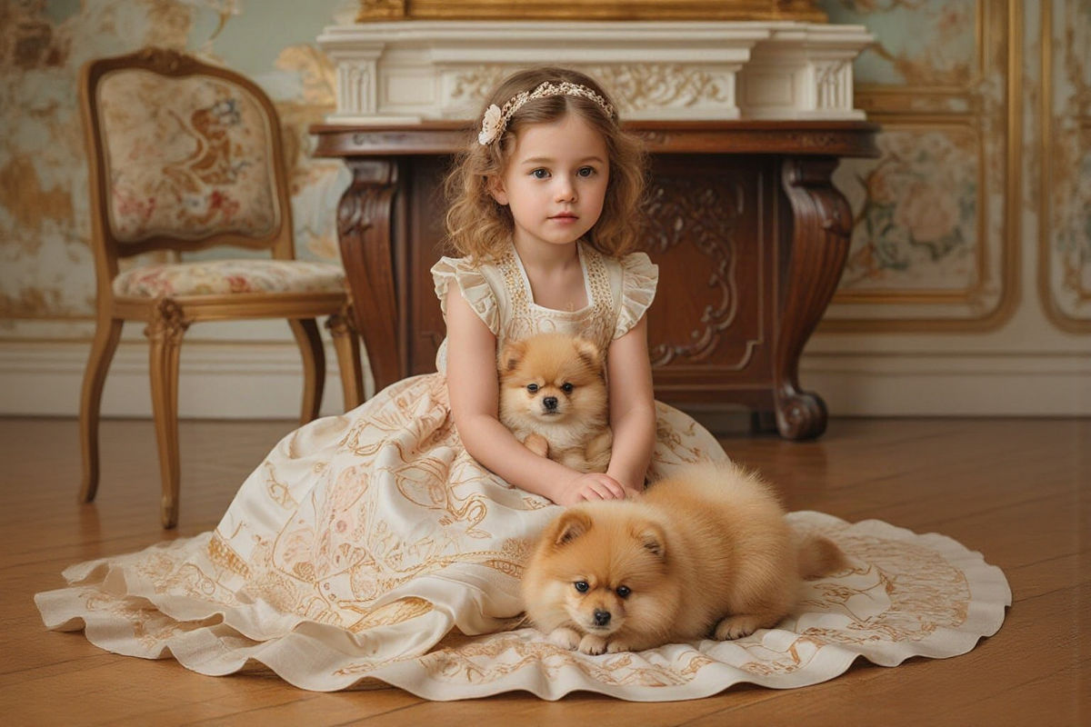 A charming image of a baby girl with black hair and green eyes in a pink dress, playing with a white Pomeranian puppy. The scene is set in a luxurious royal house with gold and pink accents, rendered in an Art Nouveau style.