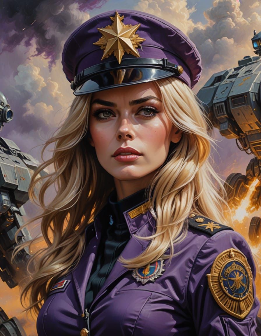 A striking picture of a cyborg robot resembling Brigitte Bardot in a metallic purple military uniform. The artwork features silver and gold colors, set against an abstract oil painting background with clouds and haze.