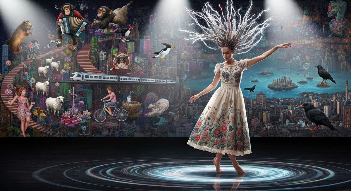 A striking picture of a dancer in a lace dress, presented in double exposure with colorful ink flow effects. This image combines psychedelic and glitch art to capture a moment of transformation on stage.