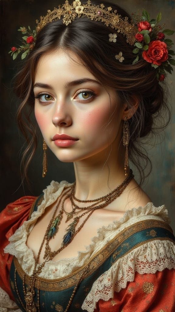 This image depicts a beautiful Ukrainian woman in traditional dress, reminiscent of portraits from the 1700s-1800s. The image has a hyperreal aesthetic.