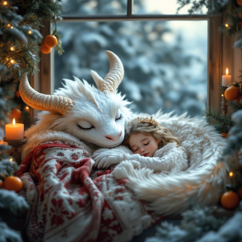 This cinematic image captures a fluffy white dragon tenderly holding a princess amidst a winter landscape. Lit by candles and adorned with pine, it's a high-quality, atmospheric masterpiece.
