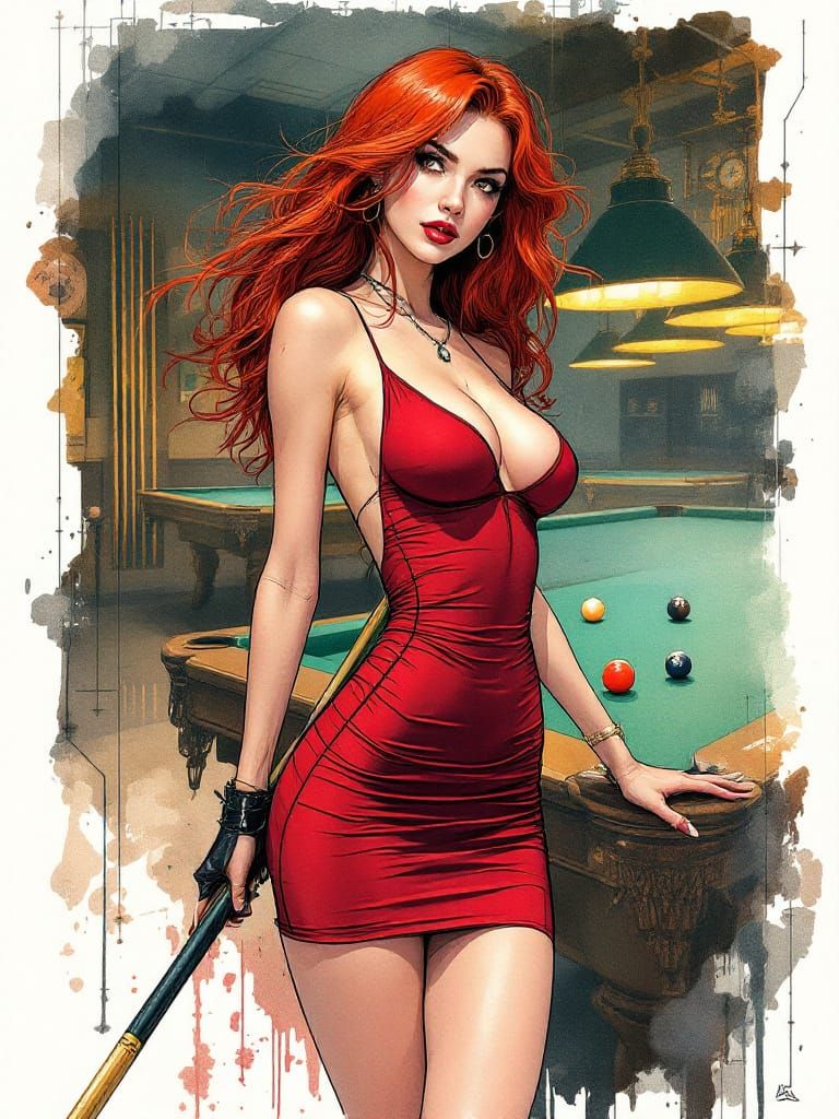 A confident woman with red hair, in a red dress and boots, holds a pool cue in a stylish pose. The image features precise ink linework and atmospheric watercolor washes, inspired by graphic novel and blueprint aesthetics.