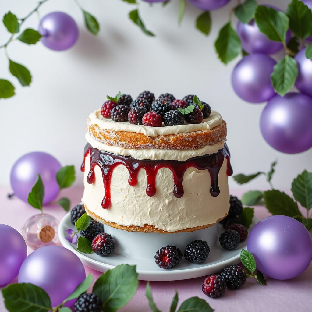 This watercolor painting depicts a beautifully decorated blackberry cake surrounded by purple balloons and lush greenery, set against a soft birthday party backdrop. The delicate brushstrokes and subtle texture evoke a classic children's book illustration style with a folk art twist.