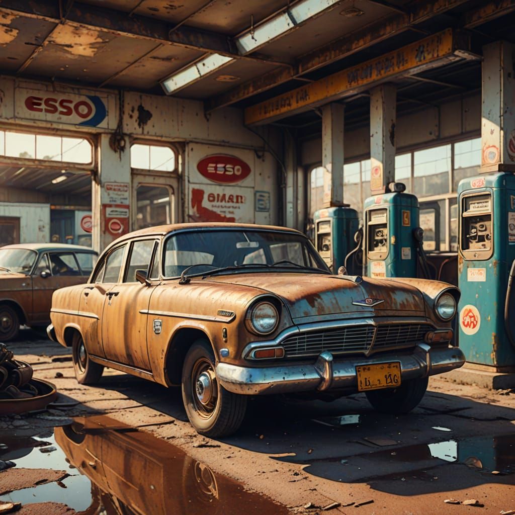 A striking picture of a classic car parked at an abandoned gas station. The image evokes a sense of nostalgia through its warm lighting, faded signs and rusty textures, all rendered in an oil painting style.