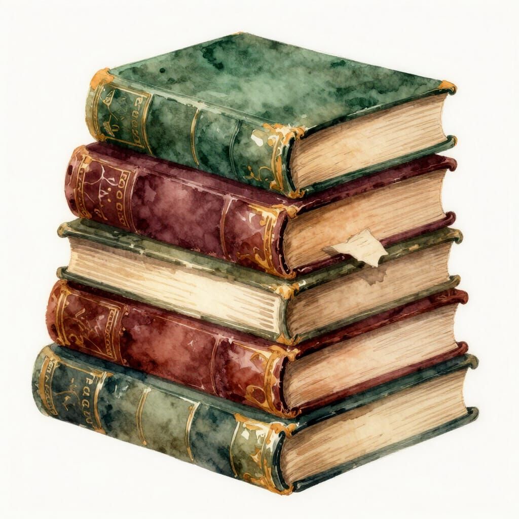 This image shows a detailed watercolor illustration of a stack of antique books with worn leather covers in rich, muted tones. Loose brushstrokes and soft colors capture the tactile quality of aged paper and leather.