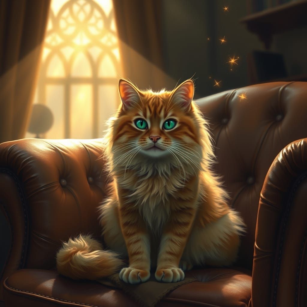 A fluffy ginger cat with glowing green eyes sits on a leather armchair, bathed in magical sunlight. This fantastical image features rich textures and soft lighting, evoking cozy mystery.