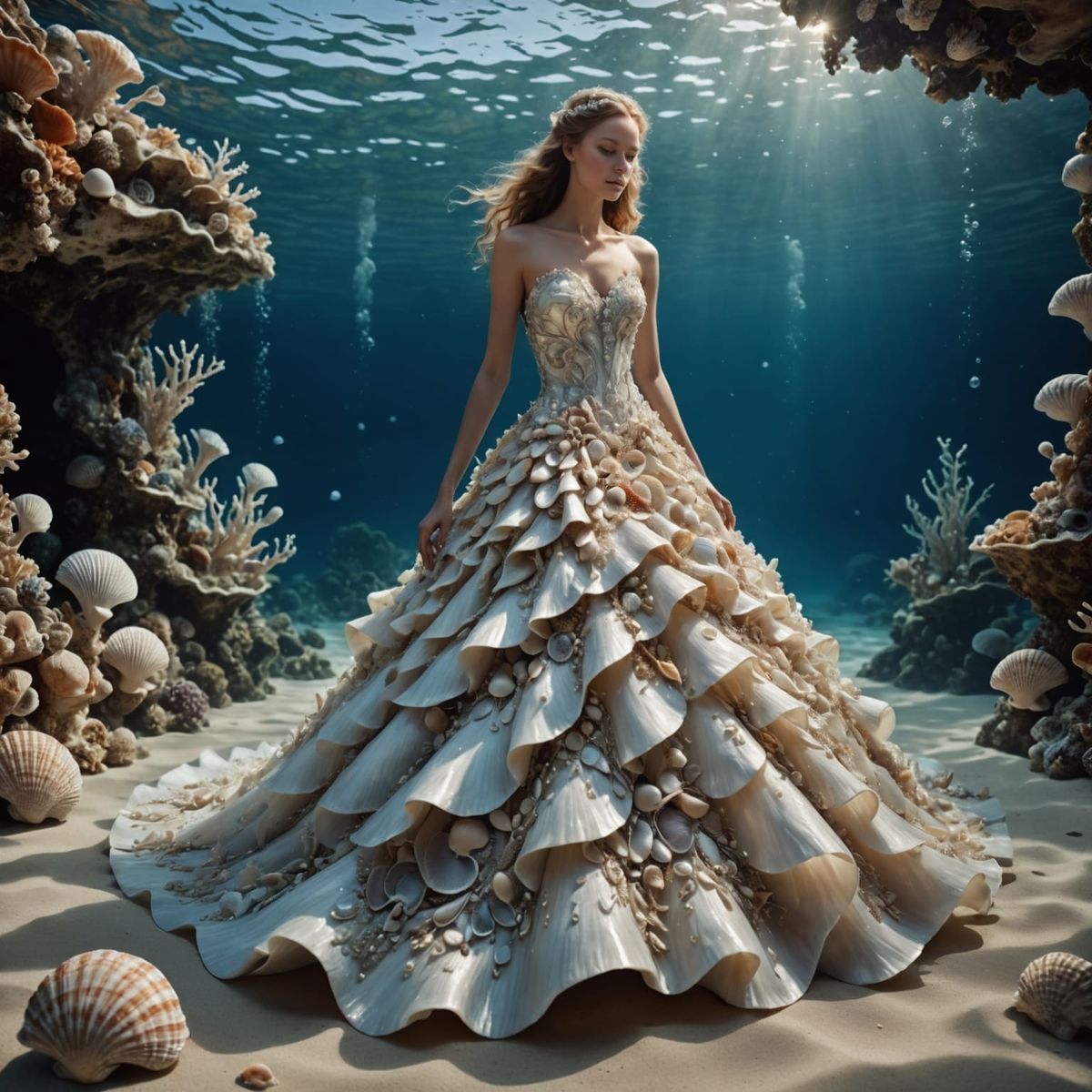This image shows a bride in a gown made of seashells, corals, and pearls, flowing like ocean waves. The picture is highly detailed with soft lighting and a dreamlike, surreal aesthetic.