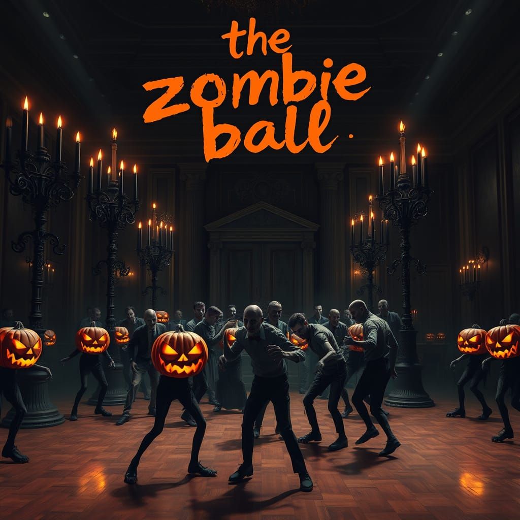 A grand ballroom scene featuring dancing zombies, illuminated by menacing jack-o'-lanterns and tall candelabras, with a chilling Halloween ambiance. Hyperrealistic horror art.