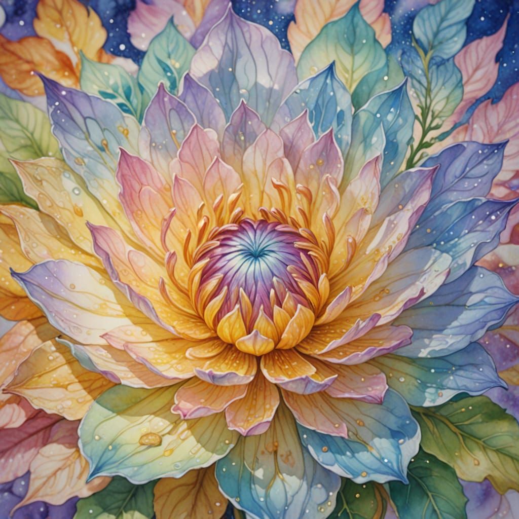 This image showcases a breathtakingly beautiful, intricately detailed magical flower humanoid in a kaleidoscope of pastel colors and golden accents, set against a soft, warm light backdrop.