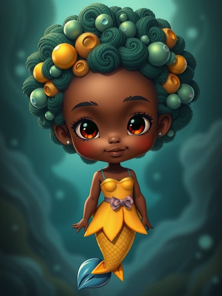 young Black chibi mermaid character, African, highly detailed, wide field of view, centered, character creation, full body, green and gold afro, yellow dress, blue tap shoes, detailed face, fantasy art background, featured on pixiv, Disney, smooth, sharp focus, realistic, wide view portrait, illustration, ...