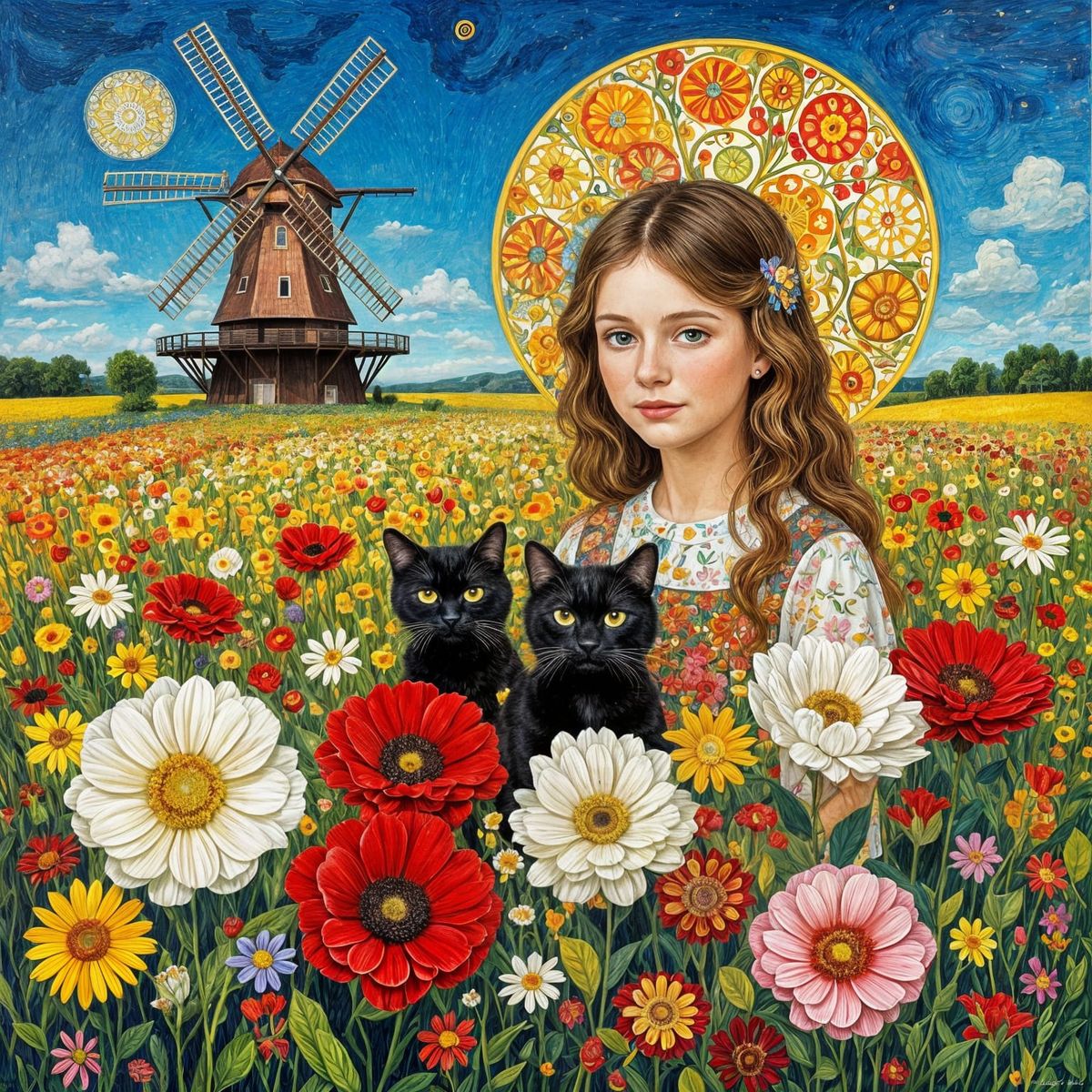 A striking picture of a vibrant garden filled with detailed, bright flowers. A young girl with a black cat appears behind the flowers, set against a deep blue sky. The artwork showcases a painterly, hyperrealistic style reminiscent of Gustav Klimt.