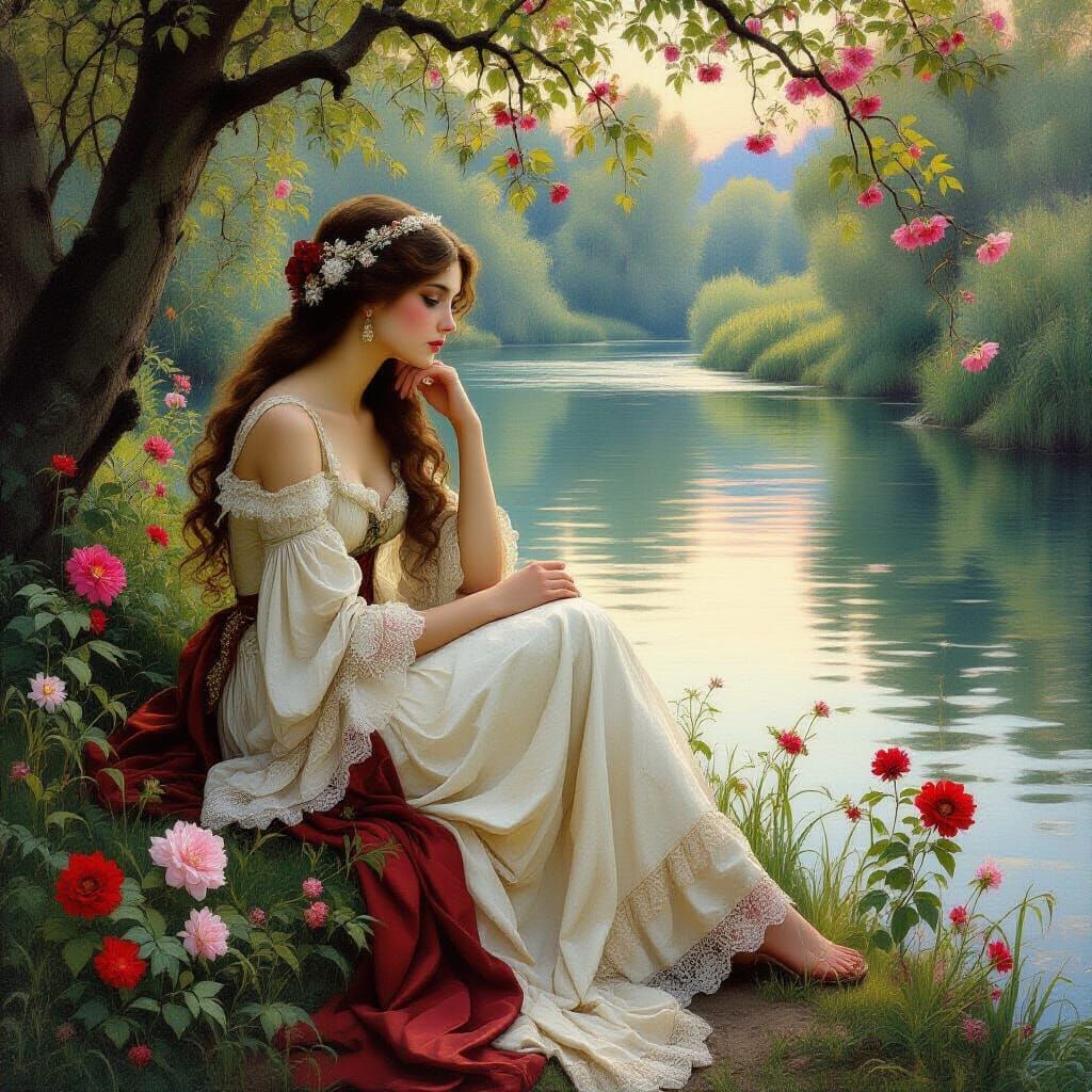 This image shows a maiden in rich fabrics seated by a river. The pre-Raphaelite style art features vibrant foliage, flowers, subtle symbolism, and delicate brushwork, creating a dreamlike scene.