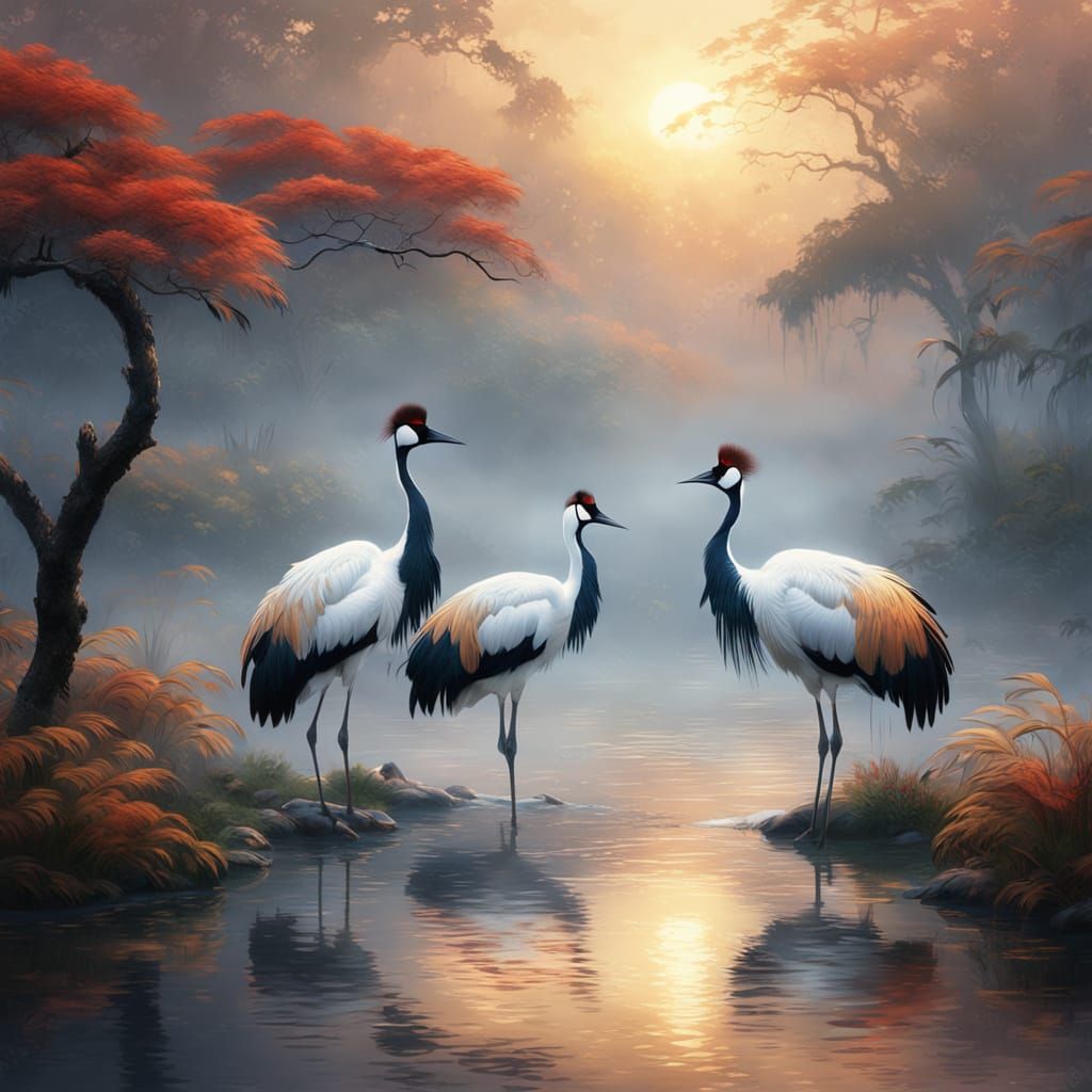 Create your own stunning and detailed fantasy art featuring red-crowned cranes. It's free and easy!
