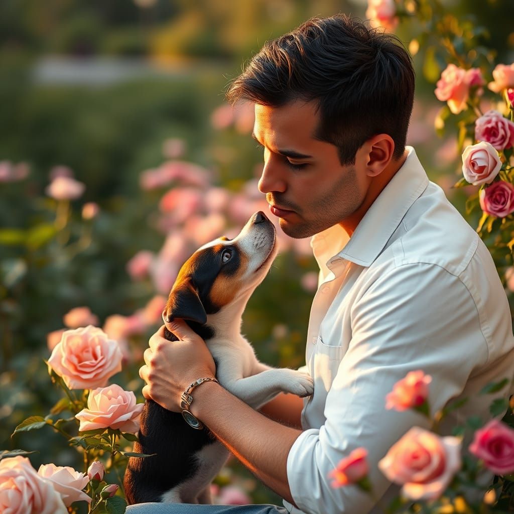 A heartwarming scene of a man with black hair and blue eyes kissing his Jack Russell puppy in a rose garden. Captured in soft golden hour light, rendered with Impressionist and Norman Rockwell-inspired warmth.