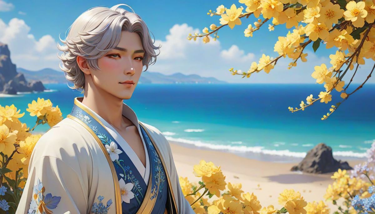 This stunning image showcases a middle-aged man standing on a sandy beach, surrounded by a vibrant watercraft and an ornate Art Nouveau frame, rendered in exquisite watercolor textures and soft brushstrokes, evoking the essence of Alfons Mucha's style