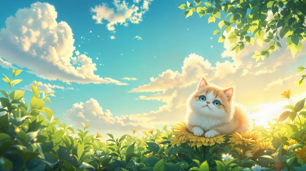 This enchanting image captures the serene beauty of a sunrise in a lush garden setting, with a fluffy cat basking in the warm golden light amidst vibrant flowers and soft, white clouds.