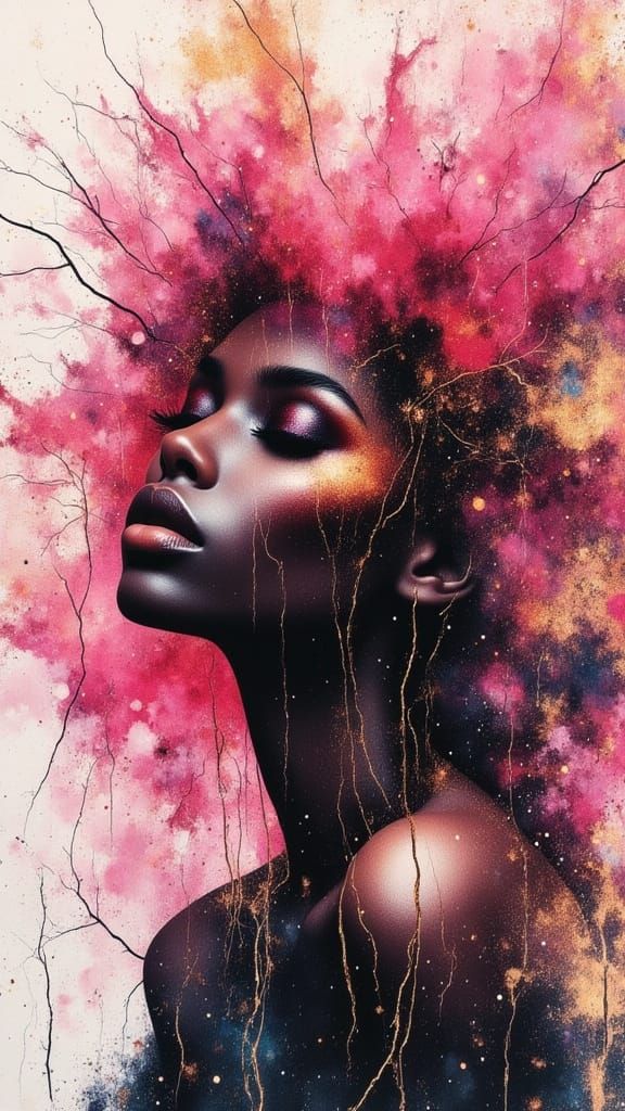A surreal, double-exposure painting of an African woman with flowing pink hair, blending gothic and romantic aesthetics in a digital airbrush style with thick, textured layers of paint.