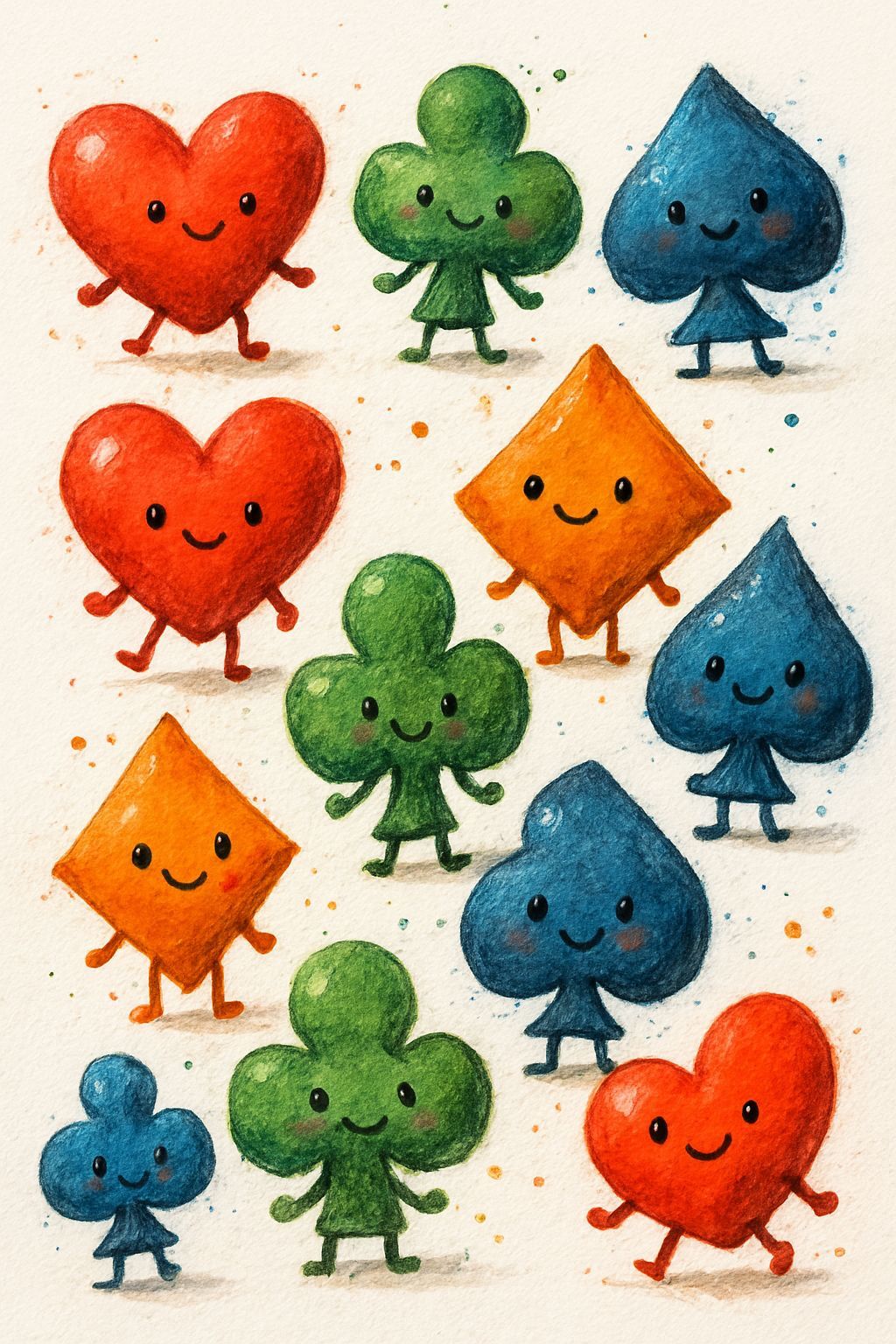 This image features adorable, anthropomorphic playing card suit creatures with tiny limbs and smiling expressions, rendered in a hyperrealistic splash art style with intricate detail and dramatic lighting.