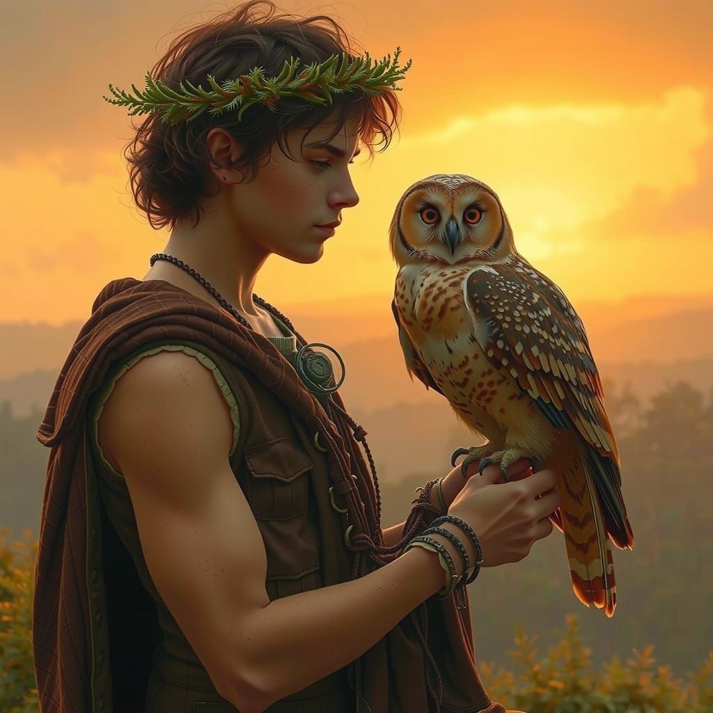 This image shows a young man in a misty forest, surrounded by ferns and moss, with a wise owl perched on his shoulder, as seen in a mystical, dreamlike painting style reminiscent of fantasy art and faerie worlds.