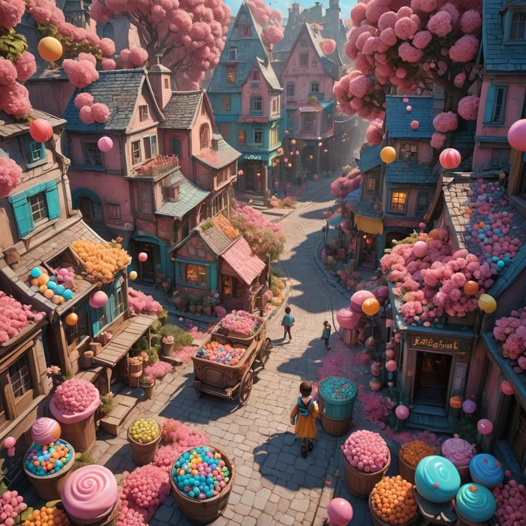 This image shows a vibrant, animated street filled with candy children. The scene is set in a fantastical environment rendered in pink and pastel tones as detailed matte painting.