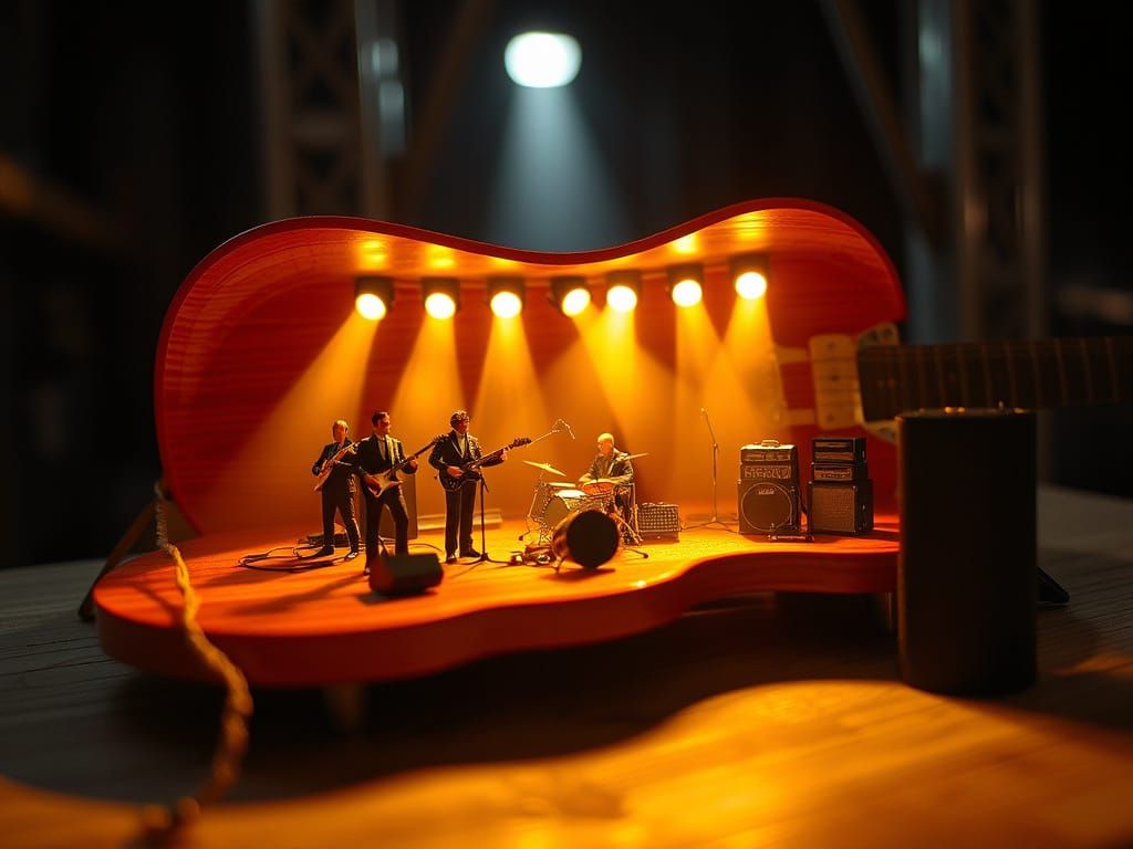 This image shows a miniature metal rock band performing inside an electric guitar. The scene is lit by spotlights, creating a magical atmosphere, rendered as a high contrast digital oil painting.