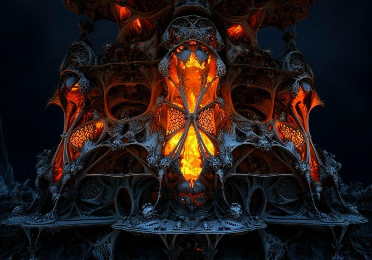 glowing ice on fire antique lace fairytale lantern in mirrored outdoor funhouse by sculptural artist "gypsum lacework" by sculptural artist "sublimascious whitework" by conceptual architect "concrete lace" by artist "glowing architectural fragment" intricate beautiful hyperdetailed complex AF shadows ...