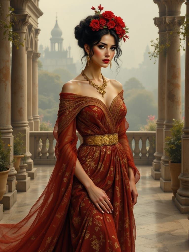 A striking picture of a regal woman in a red and gold robe. The artwork evokes ornamental gold leaf patterns and geometric motifs reminiscent of classical realism, set in a grand palace courtyard.