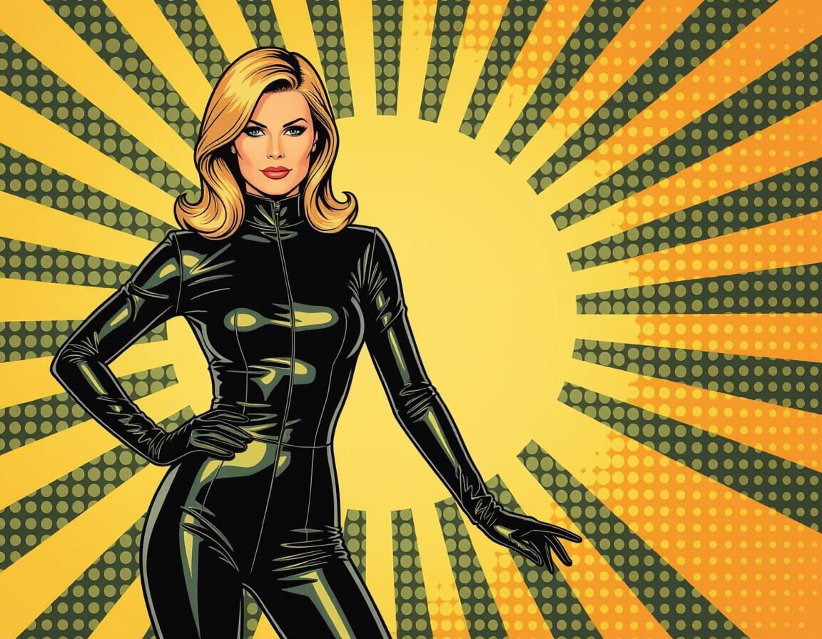 Carol Vorderman embodies 1960s mod style in a sleek leather catsuit. The image features bold lines and vibrant colors, reminiscent of classic comic art.