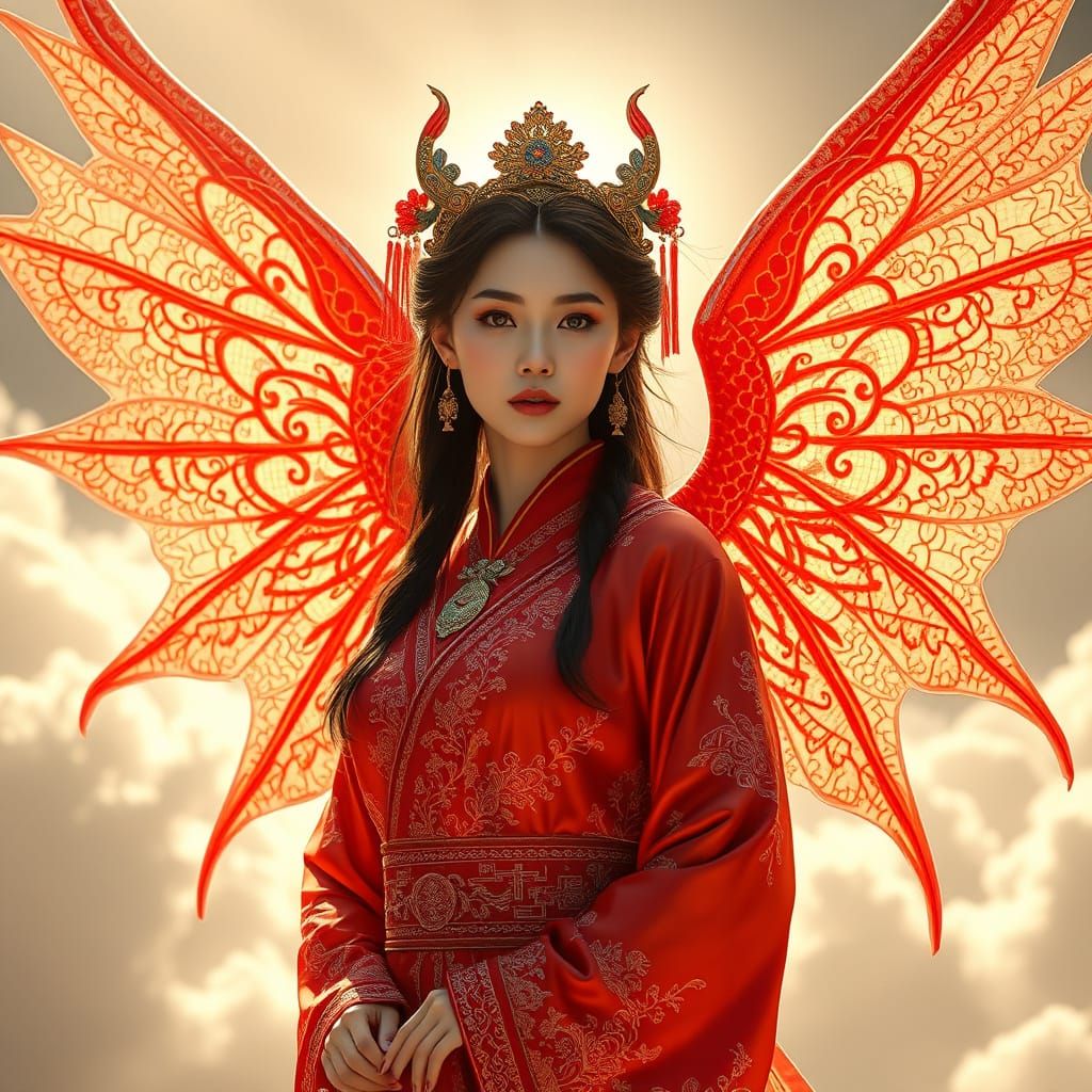 A stunning image of an oriental angel with intricate dragon-inspired attire, delicate origami lace, and Chinese-style wings, set against a majestic ancient dynasty backdrop, bathed in divine 8K sunlight.
