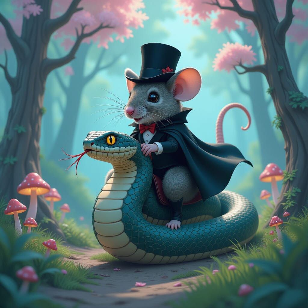 A monstrous mouse in a hat and cape rides a giant cobra through a whimsical forest with glowing mushrooms. Features cinematic lighting and intricate details, creating an eerie atmosphere.